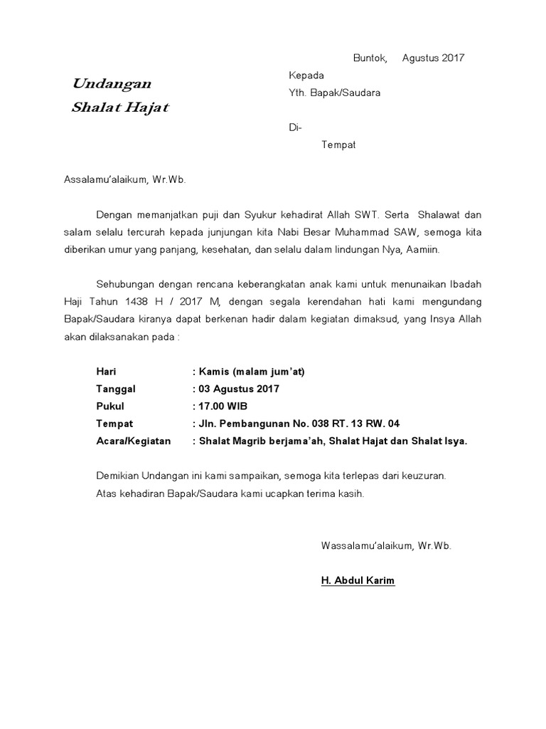 Contoh undangan sholat hajat haji contoh isi undangan. SHOLAT HAJAT Niat. Surat undangan yang resmi merupakan sebuah surat yang dikeluarkan oleh lembaga perusahaan atau instansi tertentu untuk ditujukan kepada pihak pihak yang bersangkutan dengan tujuan untuk dapat menghadiri acara yang diselenggarakan.