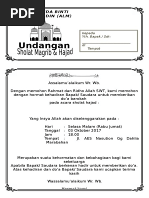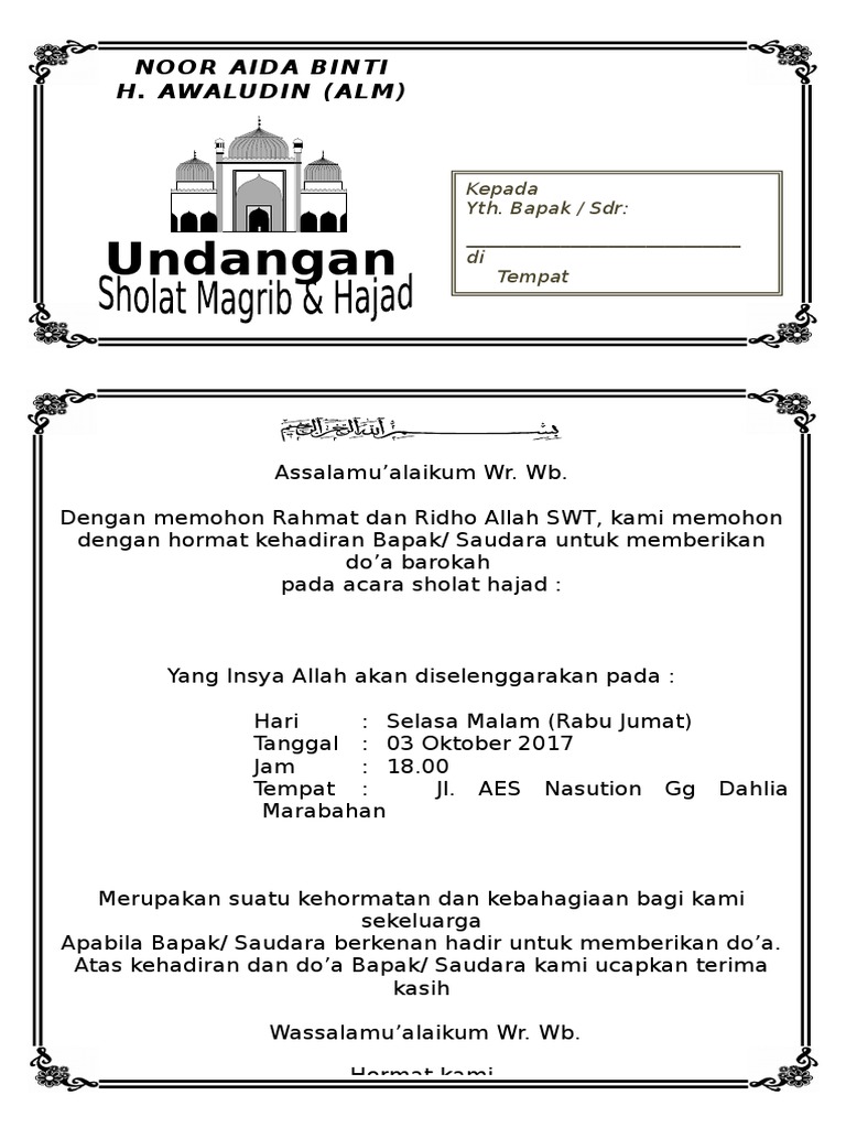 Contoh undangan sholat hajat. Informasi Undangan yang kami bagikan semoga menjadi informasi terbaik dan bisa benrmanfaat untuk semua khususnya informasi tentang Contoh Undangan Sholat Hajat Page 3 Terbaru 2020 Yang semuanya kami kumpulkan dengan serapih mungkin. Dikutip dari berbagai sumber berikut beberapa di antara alternatif bacaan doa setelah Sholat Tahajud latin dan bacaan nya lengkap. Mohon maaf apabila banyak kesalahan dalam penulisan artikel atau informasi tersebut yang ada kaitannya dengan Contoh Undangan.