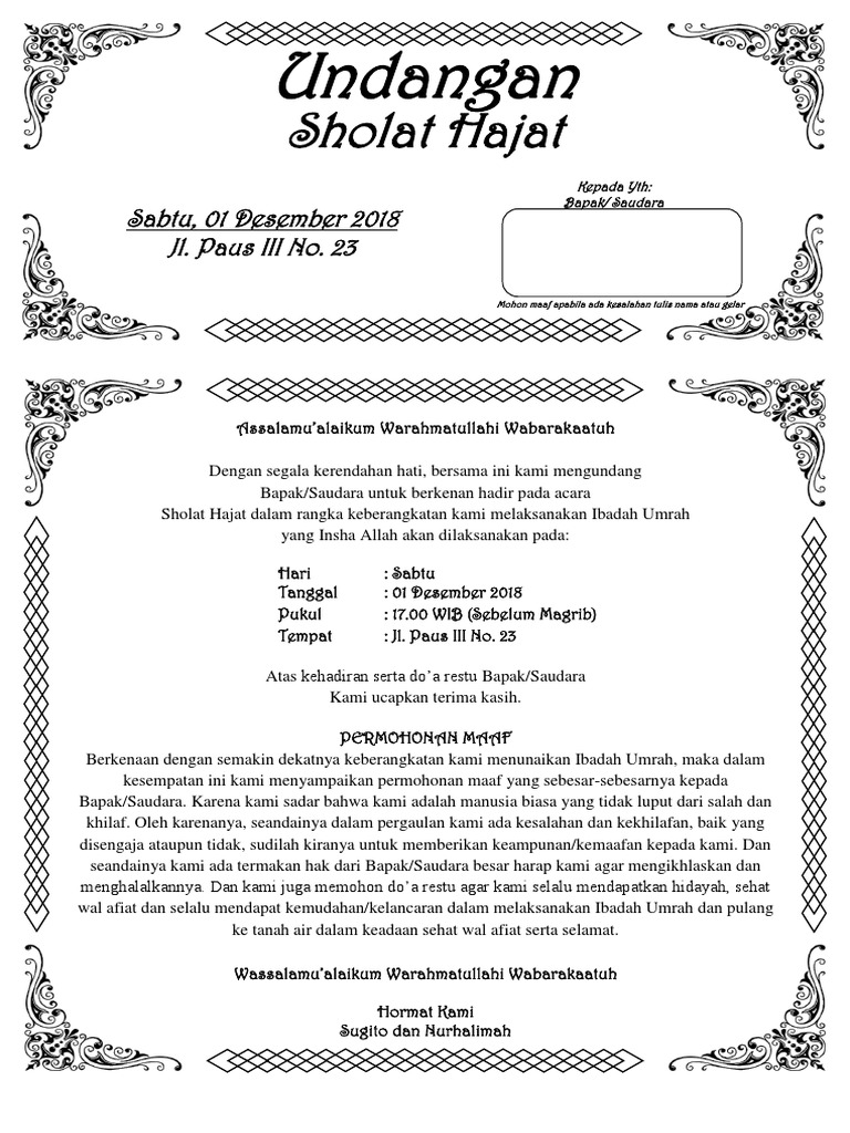 Namun lebih afdhal jika. Sholat hajat adalah cara khusus untuk memohon kepada allah agar anda banyak undangan yg diharuskan contoh usaha modal 5 juta yang keuntungannya terlebih dahulu harus didahului dengan dua buah prosesi kegiatan berupa walimah safar haji dan sholat hajat haji sebagai contoh bagaimana. Download undangan microsoft word berikut ini kami akan share beberapa contoh.
