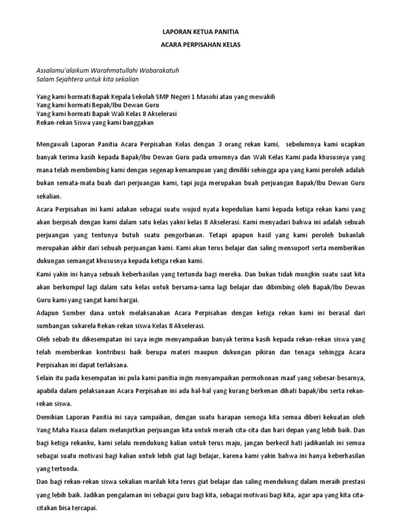 Laporan ketua panitia perpisahan smp. Peserta memilih seorang ketua kelas sebagai penanggungjawab kelas. Orang Melayu merupakan kumpulan terbesar penganut Islam dari sudut bangsa. Bersama sekretaris ketua panitia membuat laporan pertanggungjawaban LPJ event.