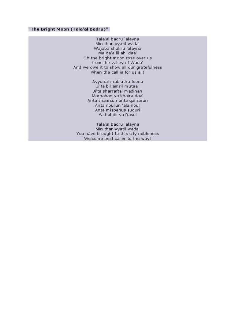 Talaa al-badru alayna Min thaniyyatil Wada Wajaba al-shukru alayna Madaa lillah ida O the white moon rose over us from the valley of Wada And we owe it to show gratefulness Where the call is to ALLAH. أنت غوثنا جميعا يا مجمل.