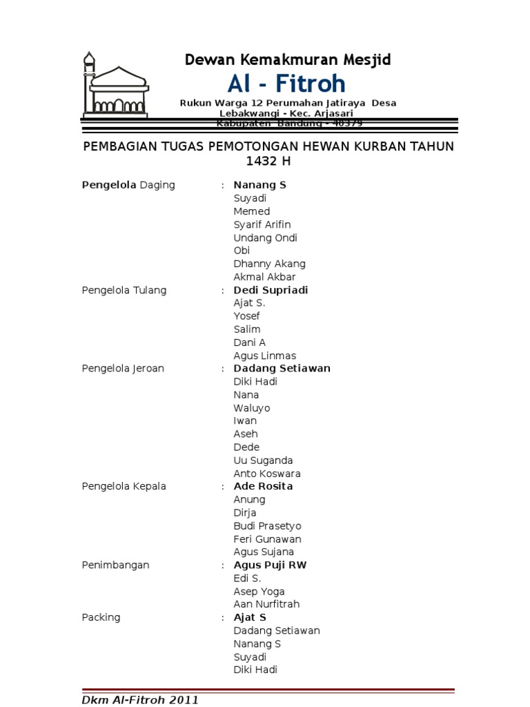 Berikut Kami berikan Contoh Surat Keputusan SK Susunan Panitia Pelaksana Qurban Hari Raya Idul Adha. X Panitia Idul Qurban 2012 Mesjid Al Hidayah Andir Tengah Id Card Panpel Qurban 1435 H Contoh Susunan Panitia Qurban Idul Adha The Leader S Panitia Qurban. Kegiatan ini akan dilaksanakan oleh Panitia Idul Adha 1434 H2013 M dan seluruh Mahasiswa LP3I Cilegon dengan susunan panitia terlampir.